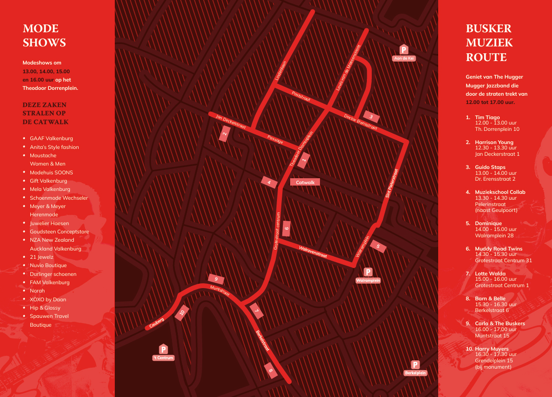 Deze zaken stralen op de catwalk: GAAF Valkenburg • Anita’s Style fashion • Moustache Women & Men • Modehuis SOONS • Gift Valkenburg • Mela Valkenburg • Schoenmode Wechseler • Meyer & Meyer Herenmode • Juwelier Haesen • Goudsteen Conceptstore • NZA New Zealand Auckland Valkenburg • 21 Jewelz • Nuvio Boutique • Durlinger schoenen • FAM Valkenburg • Norah • XOXO by Daan • Hip & Glossy • Spauwen Travel Boutique